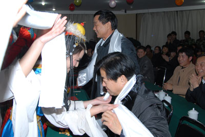 在美丽的大草原,也有一位美丽纯洁的姑娘卓玛拉。歌伴舞表演《卓玛》,美丽的草原姑娘们为观看节目的领导献上洁白的哈达。